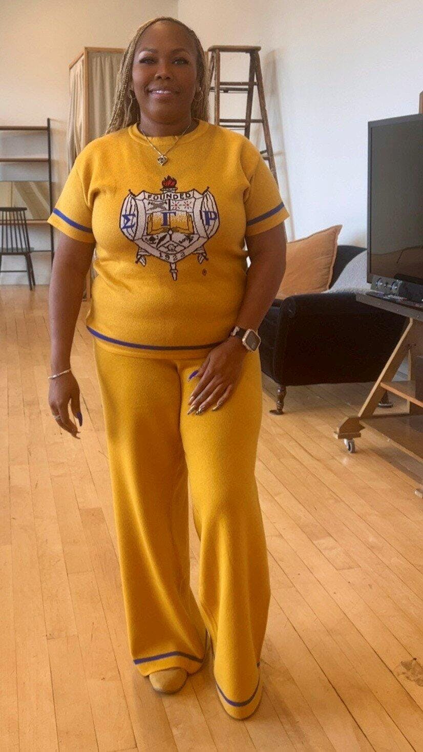 Show your Sigma Gamma Rho pride with our Knit Set, featuring a bold intarsia logo. This standout ensemble includes wide-leg knit pants, a drop-shoulder short sleeve sweater,creating a polished yet comfortable look. Perfect for making a statement, this 2 pc set combines effortless style with sorority pride.