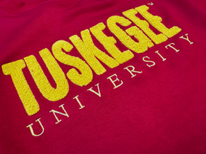 Show your Tuskegee pride with a chic off-the-shoulder silhouette. This relaxed sweatshirt features bold twill appliqué and embroidery across the chest in golden yellow on crimson red. Whether it's lounging on campus or gearing up for a casual alumni event, this cozy style has your back‚ literally and fashionably.